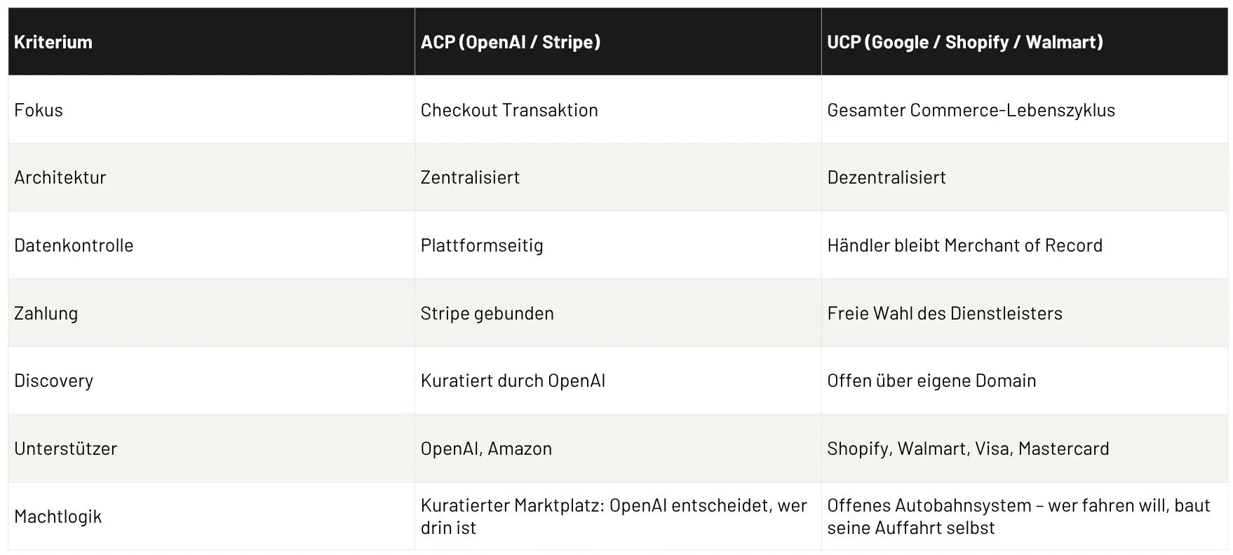 Im Hintergrund konkurrieren zwei Infrastrukturprotokolle um die Kontrolle über die Kaufschnittstelle der Zukunft. Für Händler ist die Wahl nicht binär, aber das Verständnis des Unterschieds ist strategisch entscheidend.