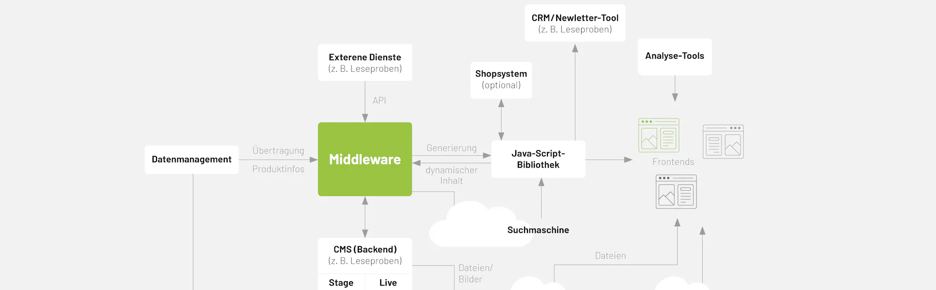 „Der Headless-Ansatz, den uns active value vorgestellt hat, war für uns sehr überzeugend“, erinnert sich Streitferdt. Headless bedeutet, dass das Backend (die zentrale Datenbank) vom Frontend (den verschiedenen Webseiten) getrennt ist. active value hat für Holtzbrinck Buchverlage eine Middleware entwickelt, über die alle Metadaten zentral gesammelt werden können. Die Middleware sendet dynamische Inhalte an die Frontends. Dort werden Produktdetailseiten generiert, indem Metadaten aus dem Backend Template-basiert zusammengefügt werden.