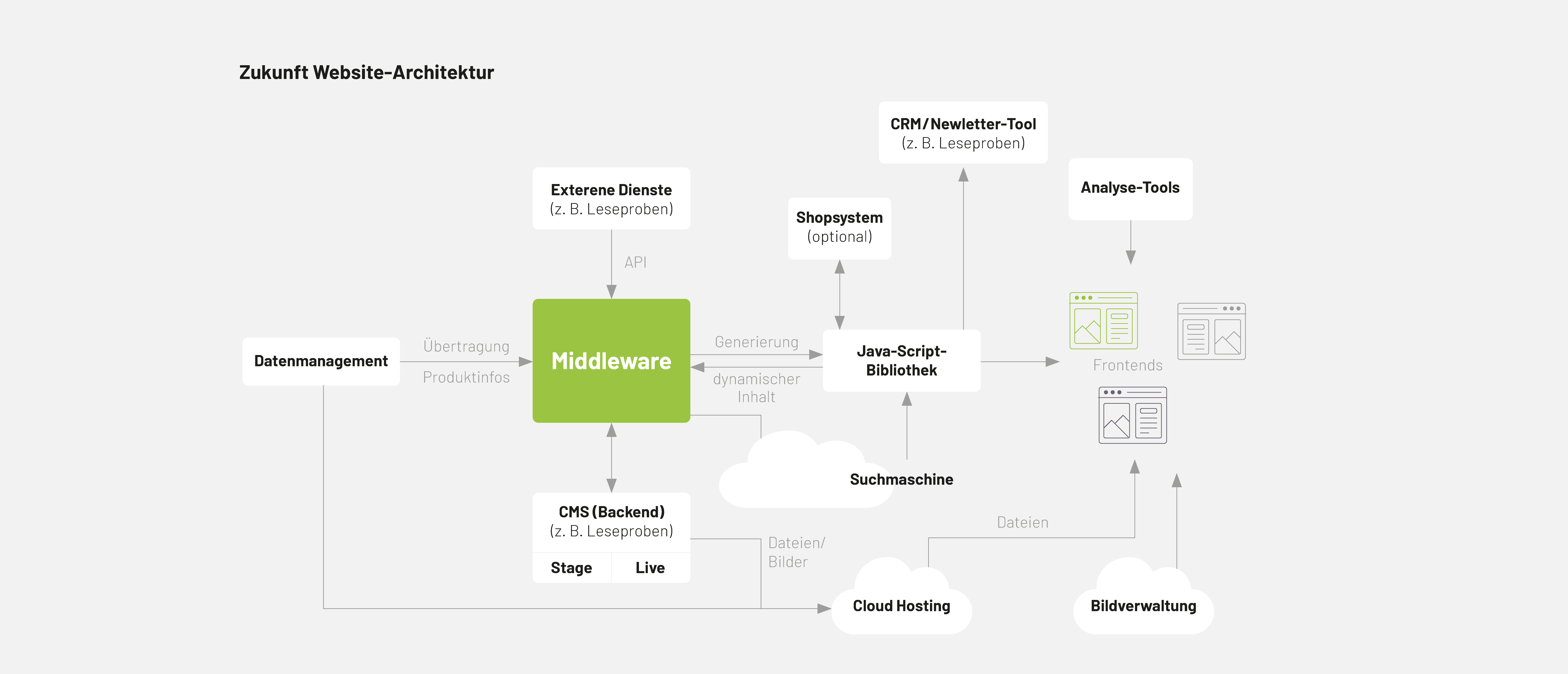 Um die Innovativität des Headless CMS weiter zu präzisieren: Dadurch, dass immer nur diejenigen Daten geladen werden, die für einen bestimmten Zweck ausgegeben werden müssen, profitiert die Performance eines Kanals. Das separate Frontend (beziehungsweise die separaten Frontends!) benötigt in den meisten Fällen kein komplexes Hosting.
